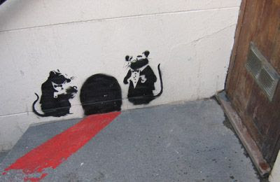 Robert Banks (born 1974), better known as Banksy, is a well-known yet pseudo-anonymous English graffiti artist from Yate near Bristol. His artworks are often satirical pieces of art which encompass topics from politics, culture, and ethics. His street art, which combines graffiti with a distinctive stencilling technique, has appeared in London and in cities around the world.